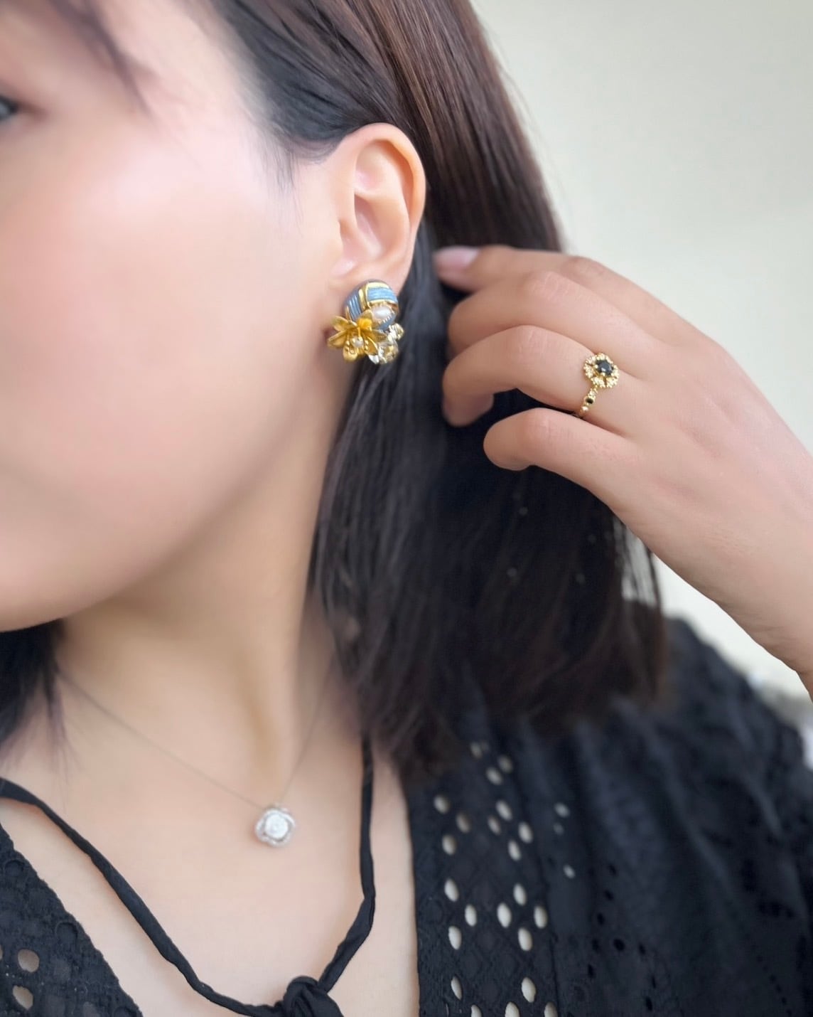 ・イヤリングは蝶バネ式で、ずれにくく痛みも少ない人気の仕様